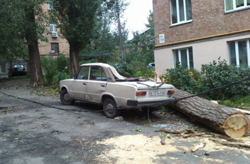 На Стратегическом шоссе, 39 в Голосеевском районе на автомобиль ВАЗ упал большой тополь. Ударившись об машину, дерево еще раз разломилось. В машине в тот момент никого не было. «Дерево упало из-за сильного ветра. В 9:00 прибыли работники «Зеленстроя» и с помощью бензопилы разрезали его на куски. А вечером владелец авто разобрал ее на детали. Машина долго не ездила. Если бы дерево упало немного правее, то последствия были бы масштабнее – там стоял целый ряд автомобилей», – рассказал «Вестям» очевидец ЧП Виталий Белошицкий. По его словам, тополь также оборвал провода. Причем электричество коммунальные службы не выключали. «Провода были разбросаны по земле, а обрывки на столбах сильно «коротили». Были вспышки и дым», – говорит он.