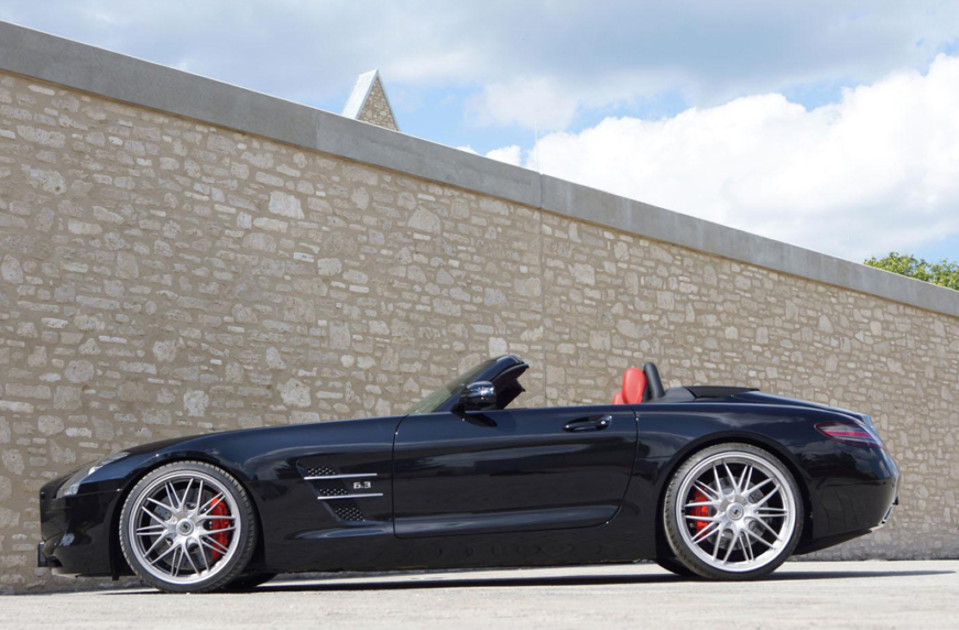 Это позволяет водителю получать больше удовольствия от вождения. После всех доработок мощность мотора составляет 571 л. с., а максимальный крутящий момент равняется 650 Нм. Что же касается колесных дисков, то на SLS AMG Roadster появились новые колеса размерностью 9 × 20 дюймов на передней оси и 11,5 × 21 дюймов на задней оси. Они обуты в шины Hankook S1 размером 255/30R20 и 295/25R21 соответственно.