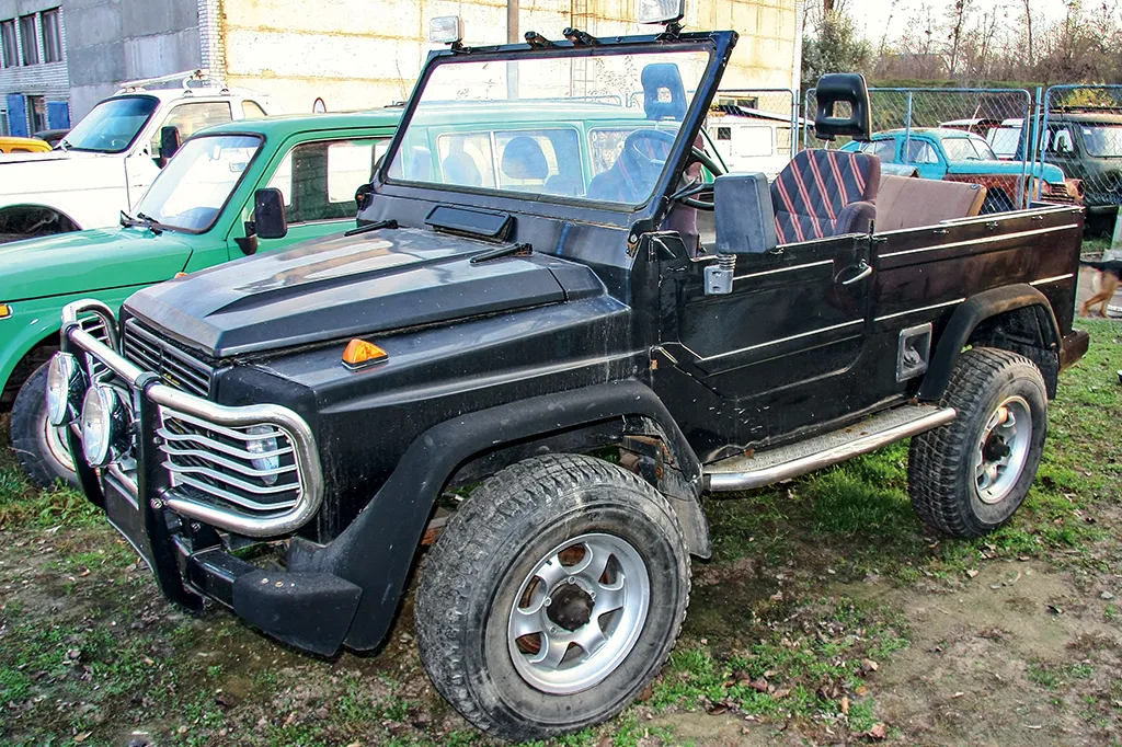 Интерьер имеет эргономику вполне скоростного авто с учетом особенностей эксплуатации на бездорожье. Передние кресла – от BMW, задний диванчик – складное сиденье из багажника универсала «Волга» ГАЗ-2402. Жесткий металлический верх собран из деталей микроавтобусов Peugeot и ЕрАЗ, в сухую погоду его можно снять.