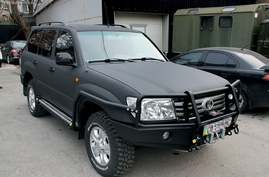 Экстерьер. Самое интересное здесь – полимерное покрытие кузова Line-X, нанесенное методом распыления прямо на заводскую краску. Слой застывшего полиуретана надежно защищает машину от царапин и ударов камнями, к тому же матовое фактурное покрытие не бликует, повышая маскировочные свойства транспортного средства. Кроме того, «сотка» получила стальные силовые бамперы, передний из которых несет электролебедку Warn и защитный отбойник из труб. Пороги из стального профиля и с нескользким покрытием служат одновременно защитой на бездорожье и подмогой при посадке в салон. На них же крепятся проушины, которые помогут вызволить машину из плена бездорожья. Снизу-спереди моторный отсек прикрыт экраном из 8-миллиметрового листа алюминия.