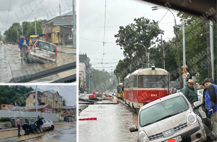 Через негоду в столиці значно ускладнено рух транспорту через численні аварії та підтоплення. Так, на вул. Кирилівській легковик вʼїхав у глибоку яму, що лишилась на місці дорожніх робіт. Очевидці зазначають, що яма там глибиною близько пів метра, зараз там після затяжної зливи – вода.