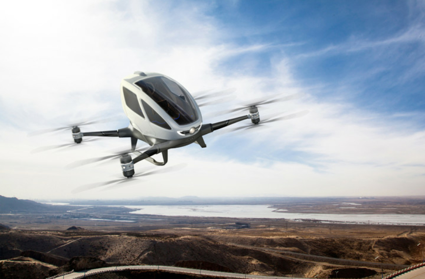 Ehang 184 напоминает уже ставшие привычными квадрокоптеры, но гораздо больше их по размерам. Это позволило установить капсулу с местом для одного пассажира.