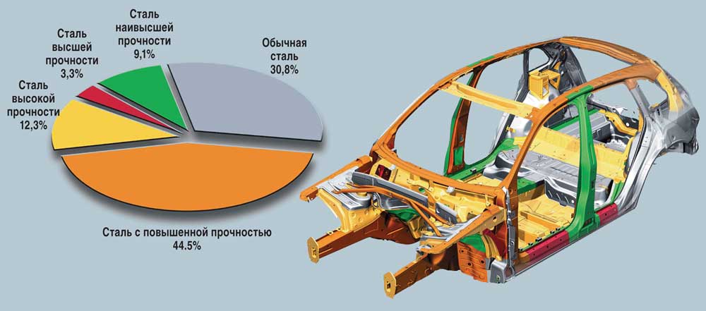 Как и сто лет назад, первое место среди материалов, используемых в производстве автомобильных кузовов, занимает сталь. Но сегодня она уже «не простая», а с разной степенью прочности: повышенной (усилие на разрыв – от 220 до 300 MPa), высокой (от 300 до 550 MPa), высшей (от 550 до 1450 МРа) и наивысшей (более 1500 МРа). Благодаря употреблению листовой стали меньшей толщины появилась возможность уменьшить вес кузова.