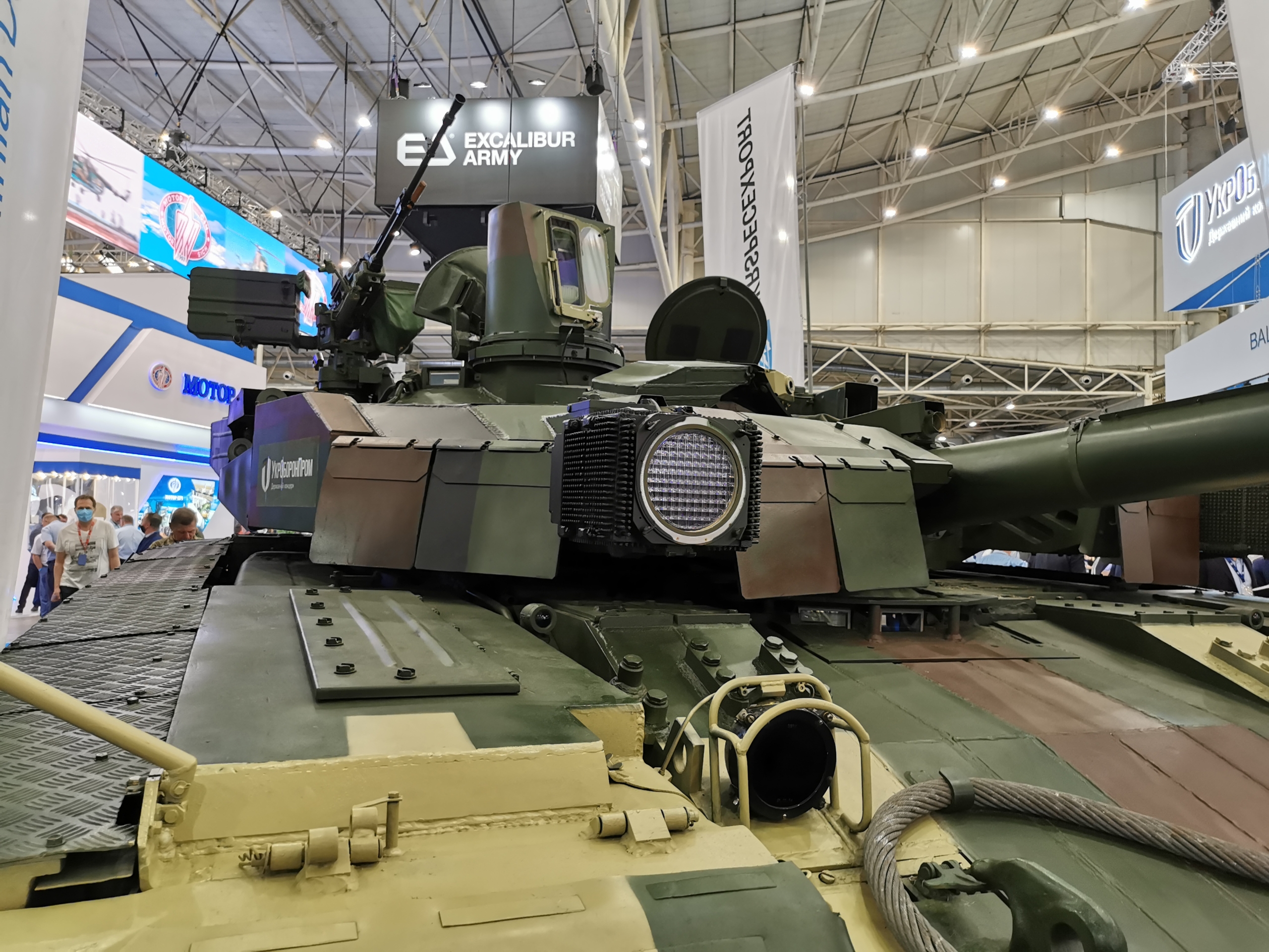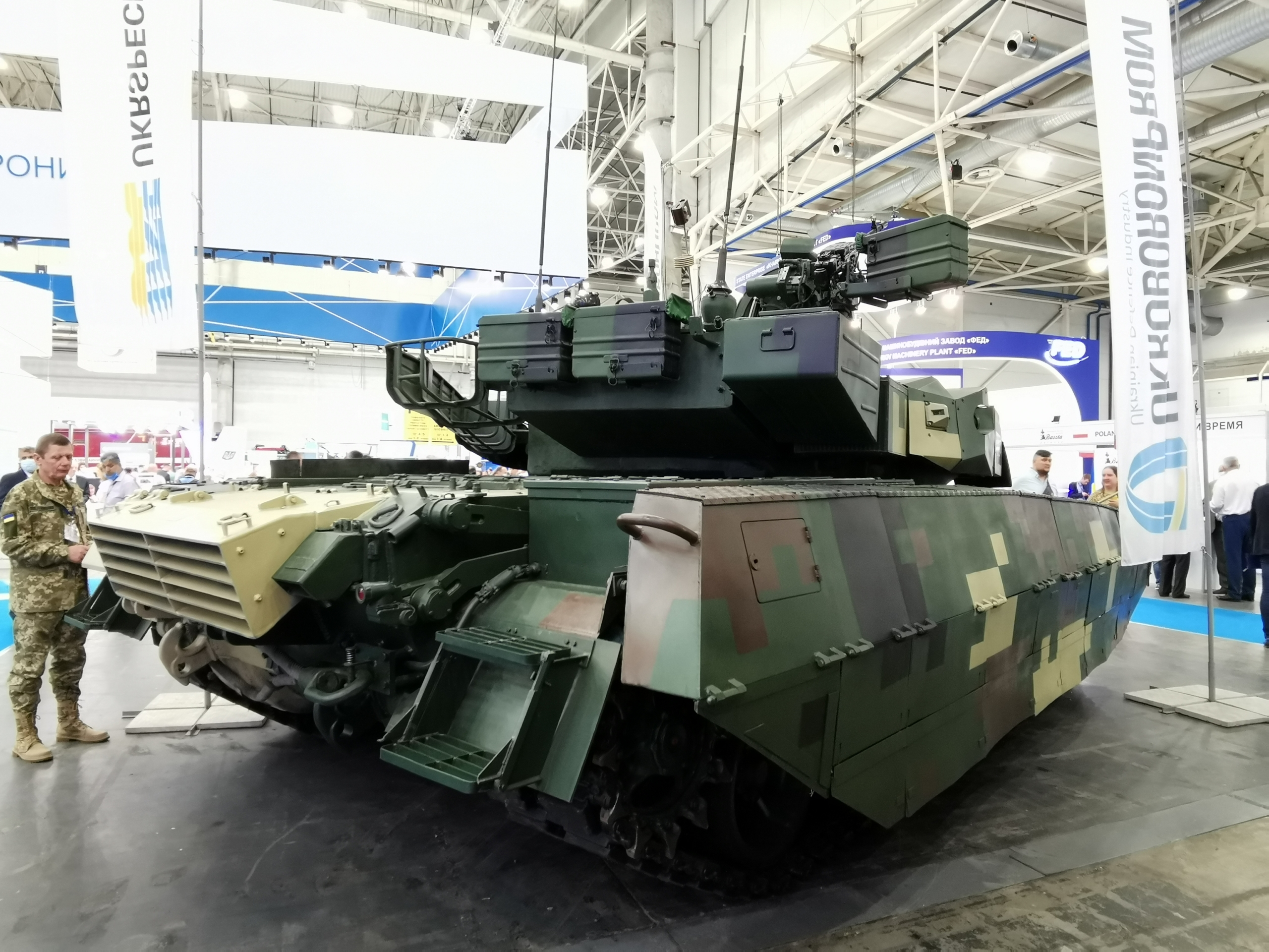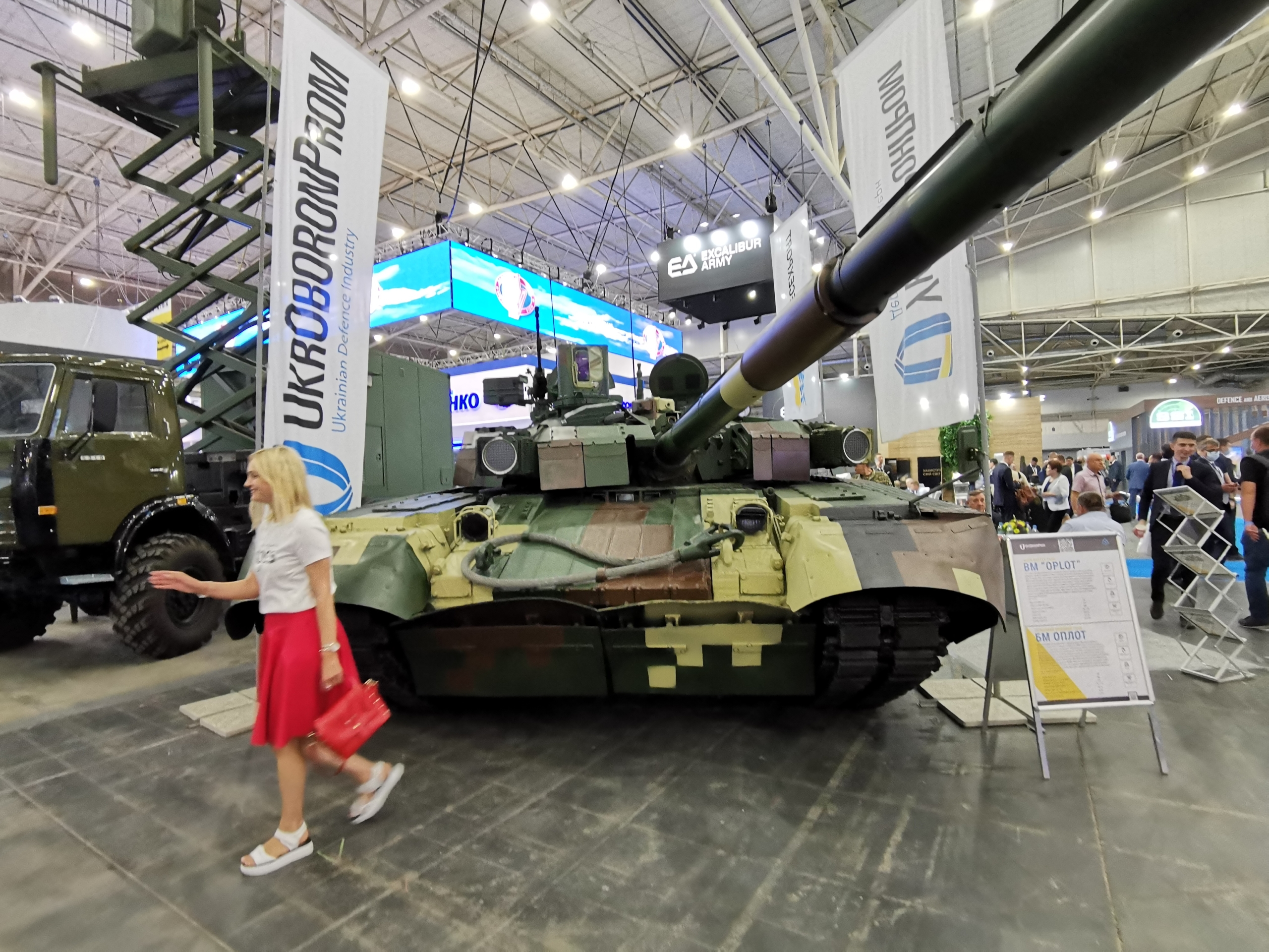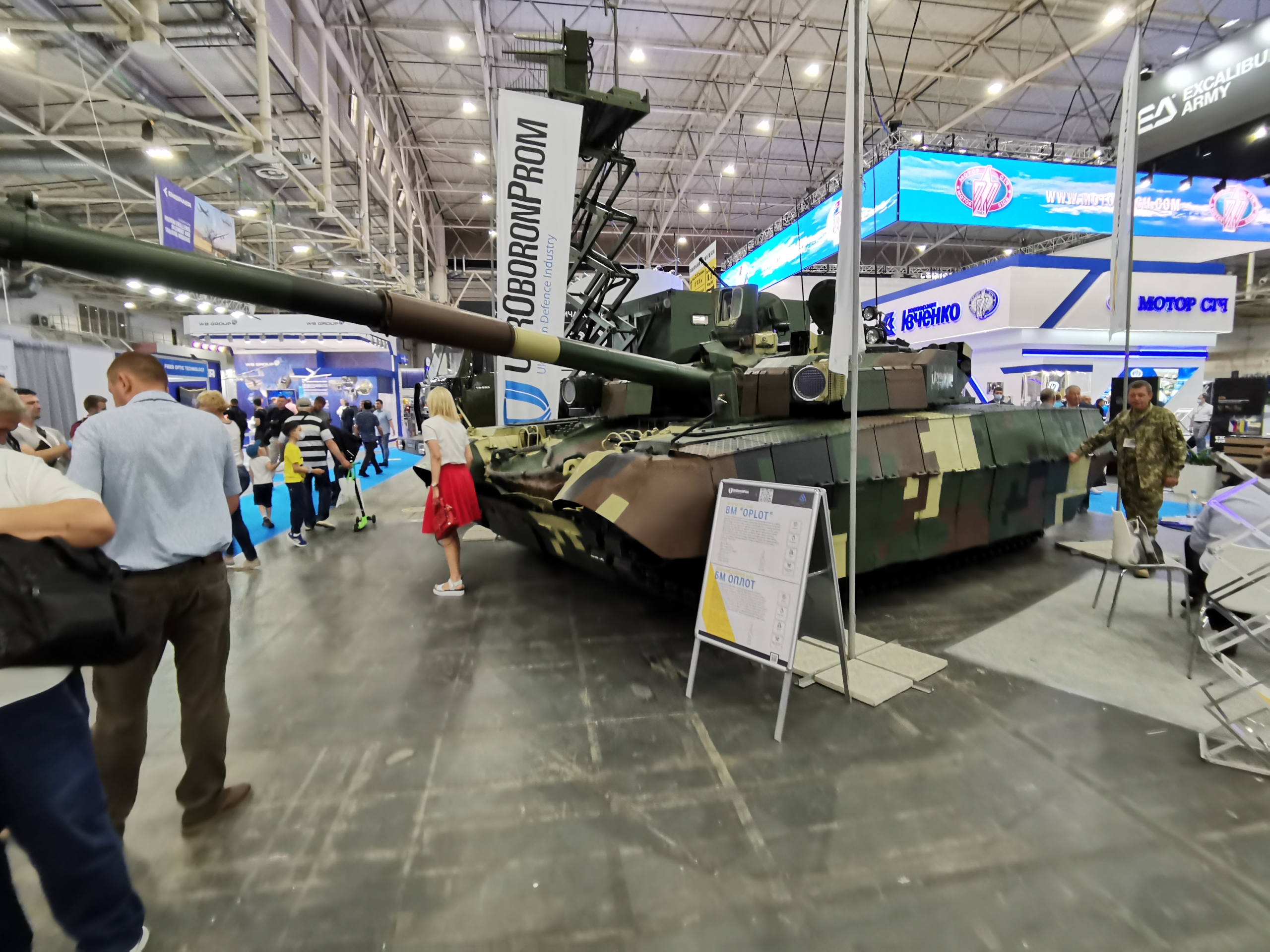 На стенде концерна «Укроборонпром» представлен современный украинский танк БМ «Оплот» полной массой 51 т. Многотопливный двигатель развивает 1200 л. с., трансмиссия – с расширенным скоростным диапазоном и комплексной системой управления движением. Максимальная скорость – до 70 км/ч.