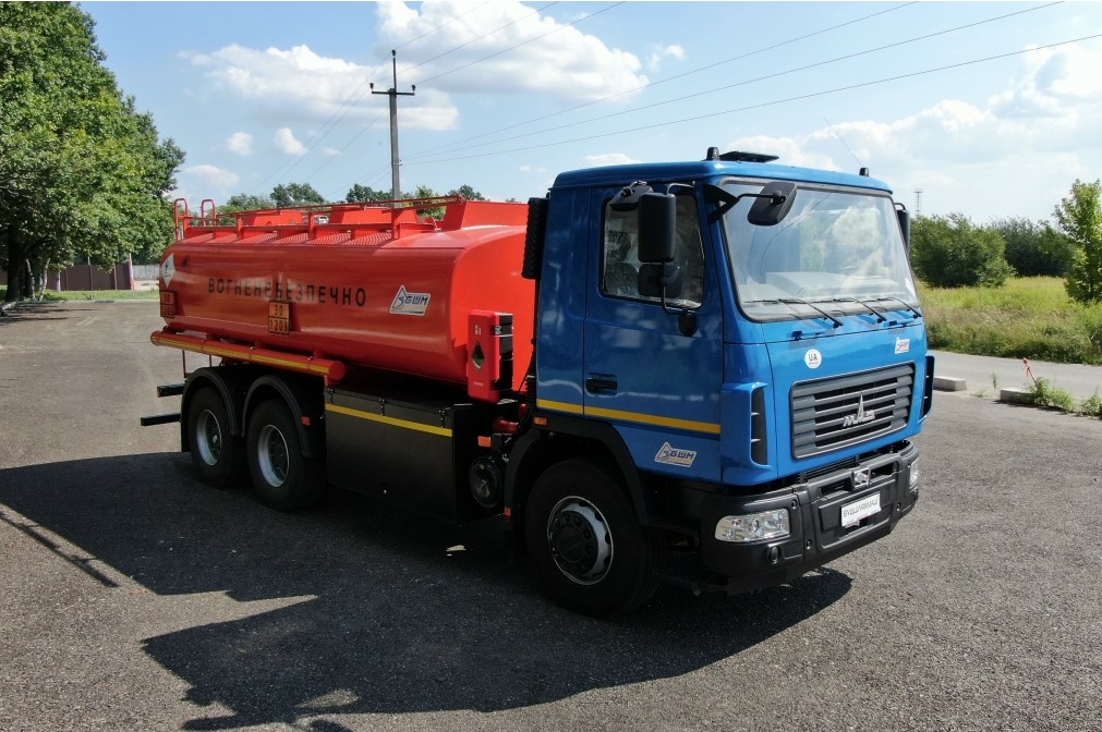 Отметим, что АТЗ-14/16 отнюдь не самый вместительный автотопливозаправщик на трехосном шасси МАЗ, представленный на украинском рынке. Куда более вместительным является 20-кубовый АТЗ-20-631208, построенный ГП “45 “Экспериментальный Механический Завод” (г. Винница). Такая машина c четырехсекционной цистерной на 20 468 литров (на фото внизу) была передана компанией “УкрЕвроМАЗ” в адрес ГП “Морской торговый порт “Южный” еще в 2012 году.