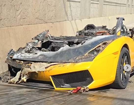 Окрашенный в желтый цвет лимитированный спорткар охватило пламенем прямо во время движения. Из-под его кузова сначала показался дым, а затем и огонь. Водитель и пассажир Lamborghini Gallardo успели покинуть его салон и, к счастью, не пострадали. А вот автомобиль выгорел полностью. Уцелели только часть переднего крыла и боковой панели, и одно из колес. Остальное превратилось в груду обугленного металла.