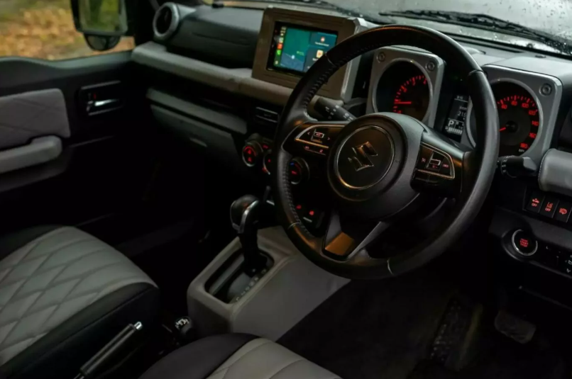 Кузов внедорожника окрасили в оттенок Audi Nardo Grey и установили черные молдинги, подчеркивающие брутальность. Завершают образ крупные колеса, обутые во внедорожные шины. Салон Jimny также немного переработали. Его отделали светло-серой и черной кожей и добавили в оснащение мультимедию Kenwood. Пробег данного экземпляра составляет 6882 мили (около 11 тысяч км), что подтверждается показателями на одометре.