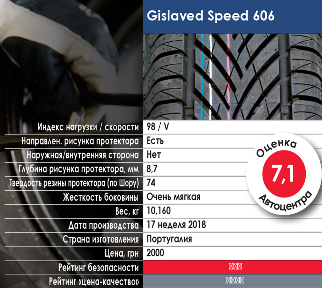 Шина Gislaved Speed 606 на мокром асфальте не позволяет ехать достаточно быстро, так как появляются заносы, которые удается легко устранить сбросом газа. При этом поведение на мокром у шины стабильно, без сюрпризов. На сухом асфальте в тесте «переставка» шина при первом маневре может стать причиной более глубокого, чем у лидеров, сноса колес передней оси, а уже потом, после возвращения на свою полосу движения, возникает глубокий занос.