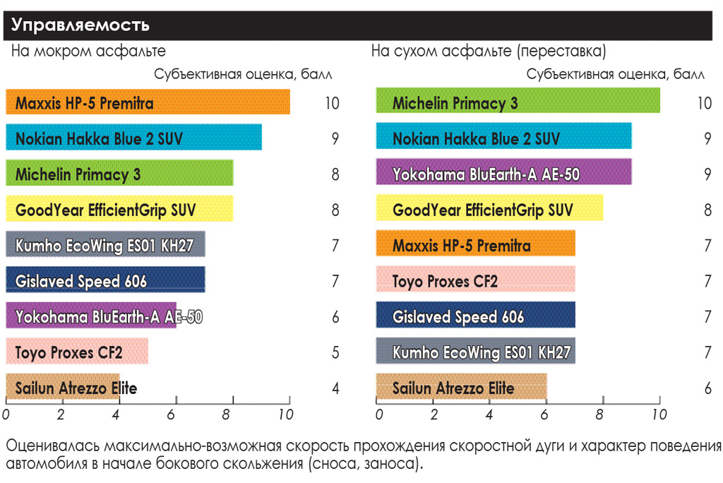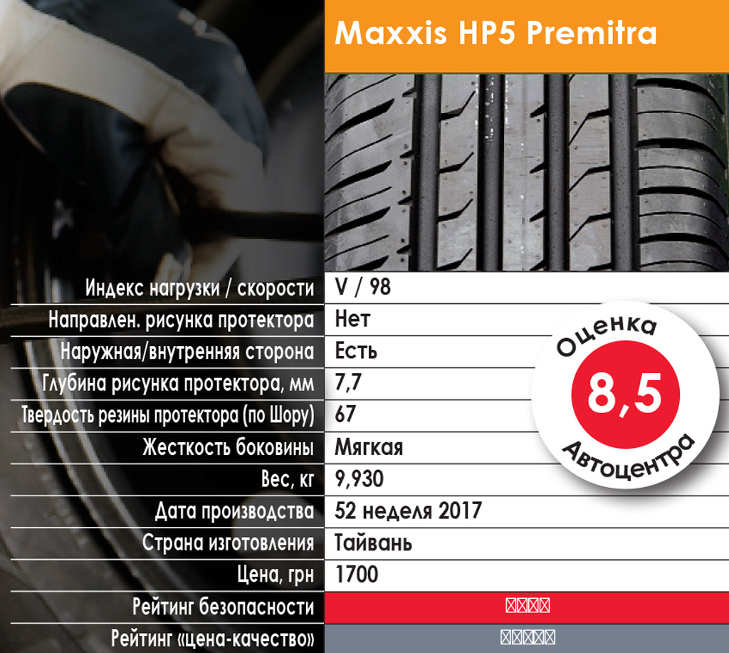 Шина Maxxis HP5 Premitra была самой быстрой в тесте «управляемость на мокром асфальте». Автомобиль в этих шинах точно реагирует на повороты руля, маневры удается совершать на высокой скорости,. При превышении скорости могут возникнуть небольшие сносы. На сухом асфальте шина HP5 Premitra также позволяет ехать быстро, скорость прохождения переставки чуть ниже чем у лидеров. При маневрах эта шина оказалась самой тихой.