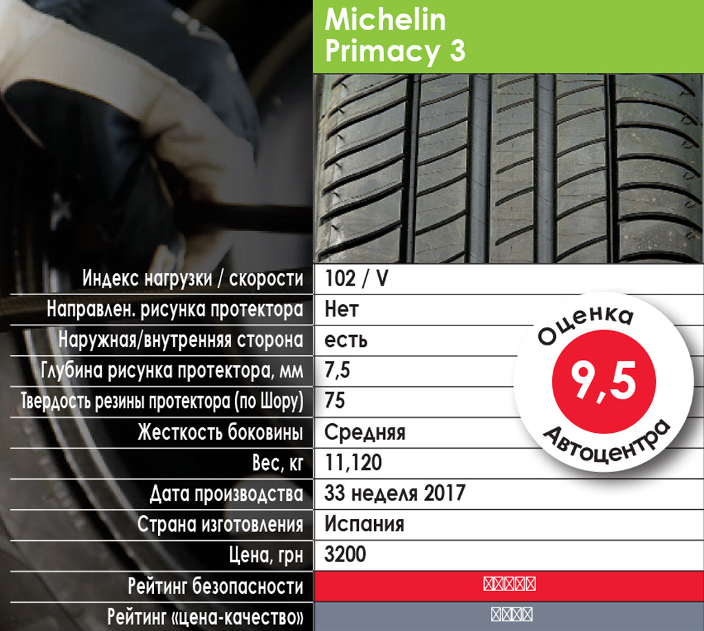 Уровень безопасности шин оценивался на основании семи разных тестов. Итоговая оценка при этом, традиционно, выводилась с учетом весомости каждого теста и субъективности оценки. По результатам все испытаний первое место в тесте разделили две шины Michelin Primacy 3 и Nokian Hakka Blue 2 SUV. Отличия у них лишь в том, что Hakka Blue 2 SUV обладает чуть лучшими свойствами на более опасном мокром асфальте, а Primacy 3 показала себя чуть лучше на сухом асфальте. Только эти две модели получили 5 звезд в рейтинге безопасности.