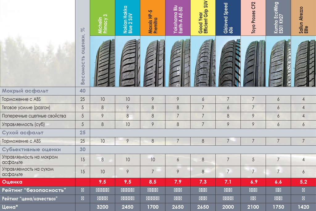Конечно же, самым главным критерием оценки являлся уровень безопасности, которую обеспечивает каждая шина, участвующая в тесте. Именно характеристики шин, которые определяют безопасность на дороге стали основой для составления рейтинга безопасности шин. Традиционно, оценили у шин и соотношение «цена-качество». Кроме того, в этом тесте попутно преследовали еще несколько целей. Например, изучали поведение шин, производители которых их названием информировали об их специальных свойствах, например, эко-шины, которые должны снизить расход топлива.