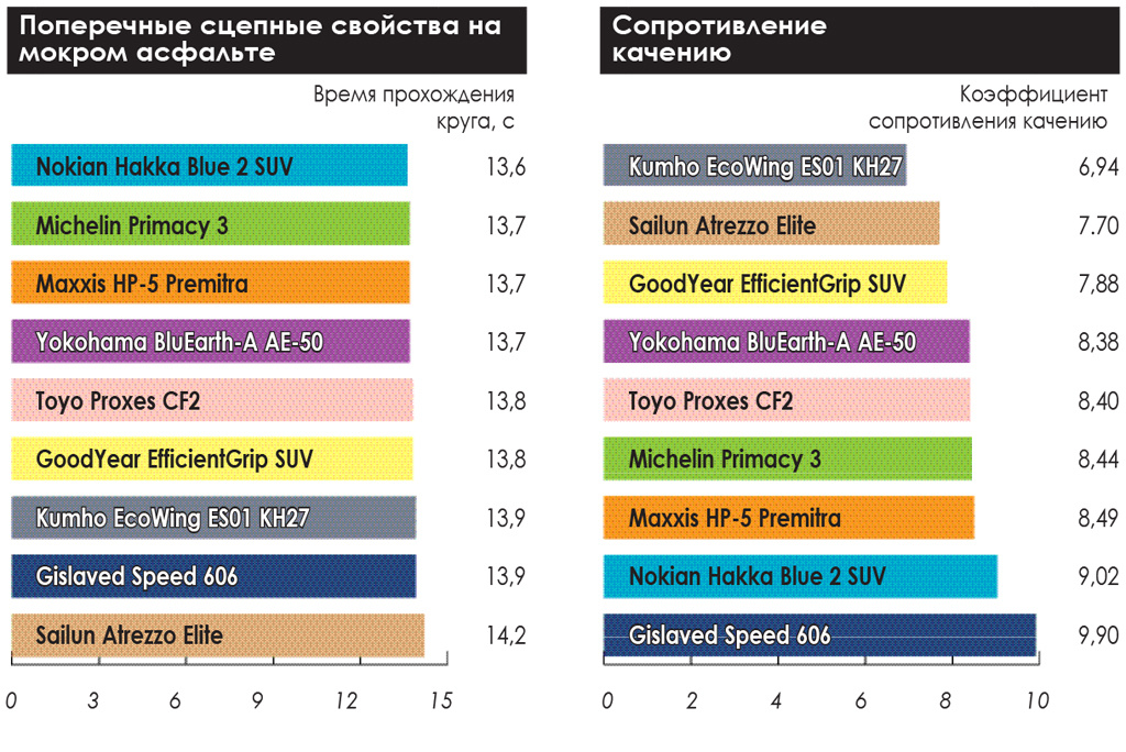 Немаловажным для некоторых автовладельцев является и такой параметр, как влияние шины на ресурс подвески. Для оценки этого параметра следует учитывать несколько факторов – и вес шины, и жесткость каркаса шины в целом и боковины. В нашем распоряжении оказалось только две характеристики шины – вес и жесткость боковины. Учитывая только их, наилучшей по этому критерию оказалась шина Maxxis HP-5 Premitra с ее весом в 9,930 килограмм и мягкой боковиной. Далее выстроились модели Sailun Atrezzo Elite, Kumho EcoWing ES01 KH27, Gislaved Speed 606 и GoodYear EfficientGrip SUV.