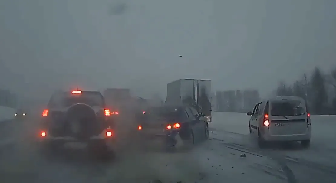 На видео можно увидеть, как сильный снегопад снижает видимость практически до нуля, что приводит к ДТП с участием большого количества автомобилей.