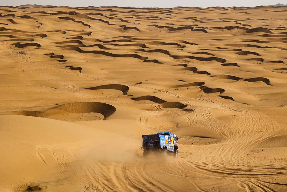 Одну из многочисленных дюн, которые начались уже через 3 км после старта, не смог преодолеть лидер грузового зачёта Дмитрий Сотников на Камазе. Пришлось спускаться назад и повторять маневр. Ему это удалось. А через 170 км пошли более скоростные участки, что сыграло на руку.