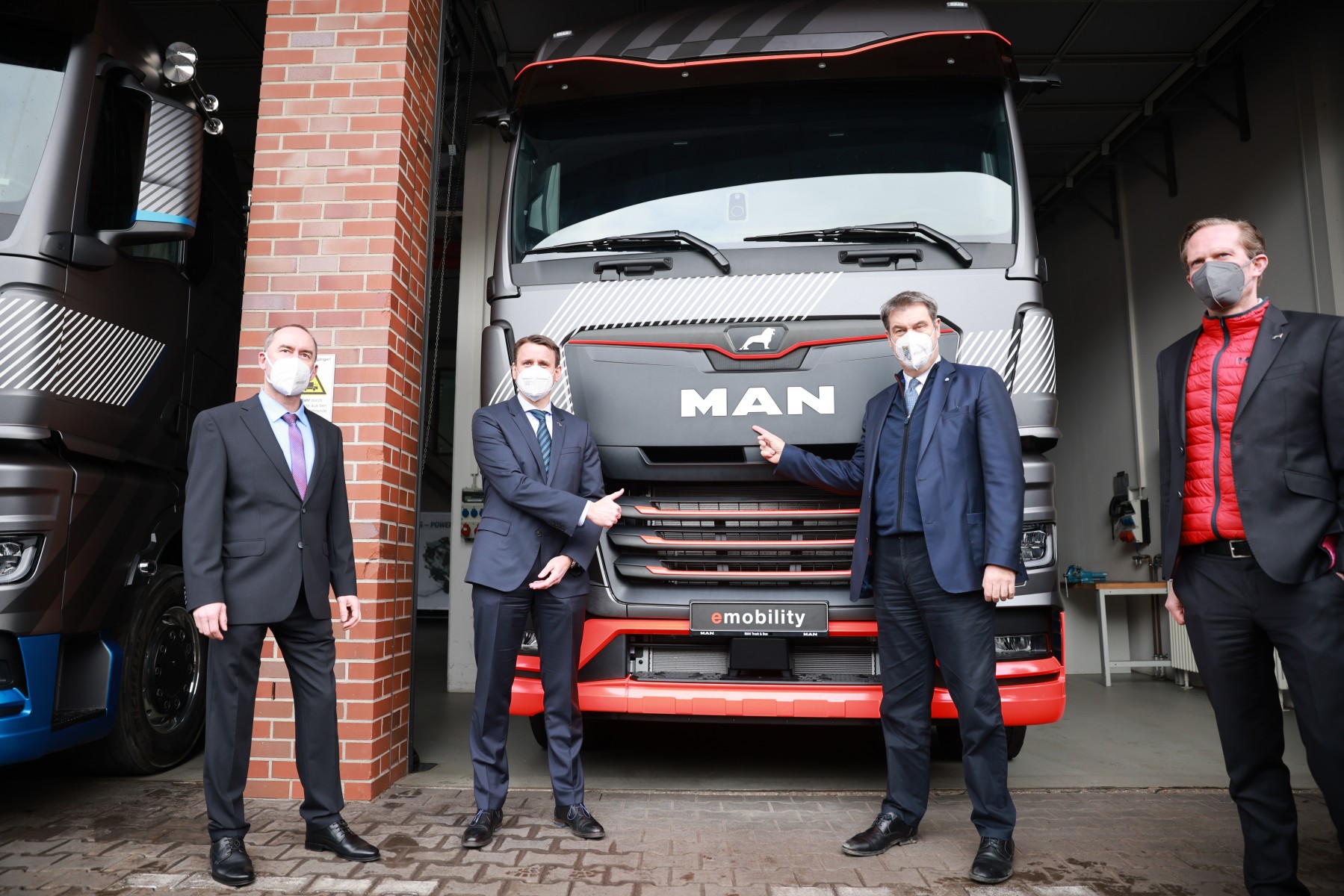 Cлева направо: Губерт Айвангер, Министр экономики Баварии, Александер Власкамп, генеральный директор MAN Truck & Bus, д-р Маркус Сьодер, президент-министр Баварии, и д-р Фредерик Зом, технический директор MAN Truck & Bus.