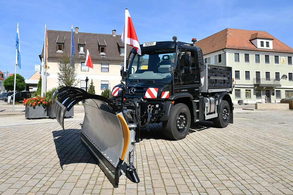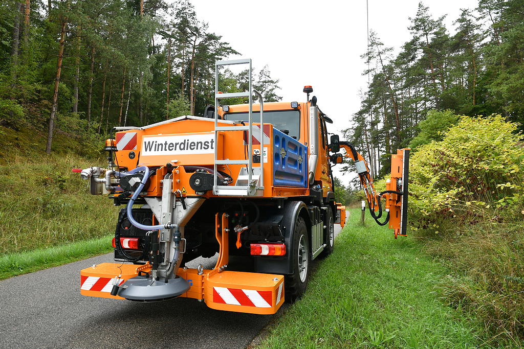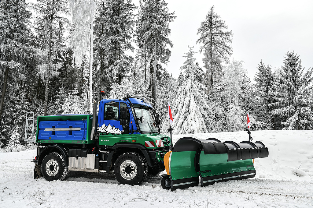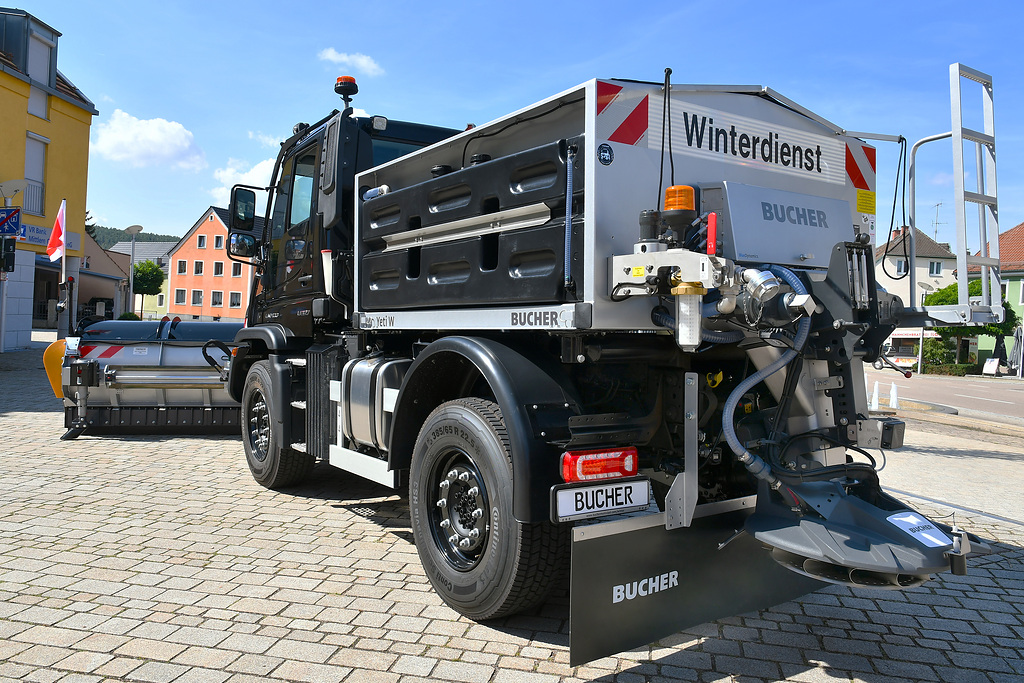 Cледующий Unimog – U327 укомплектован надстройкой марки Bucher и предназначен для зимнего содержания дорог. Спереди машина оснащена снегоуборочным отвалом Teplex TE 90.30/40S, а сзади – оборудованием Yeti Eco FS50 для нанесения антигололедной смеси в пропорции 50% соли и 50% жидкого реагента. Бункер вмещает 2 м куб. соли и 2000 л жидкого реагента.