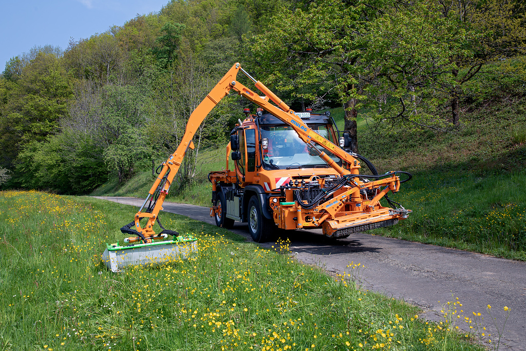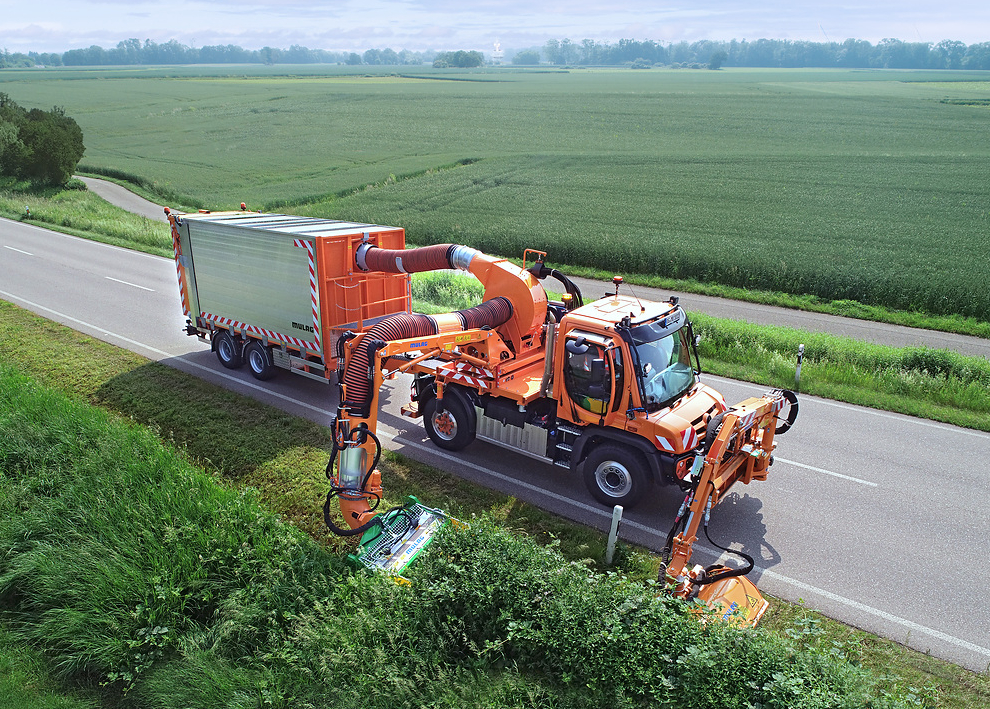Это модель U535 c газонокосилками Mulag ECO. Передняя стрела МКМ 700 cлужит для работы в труднодоступных местах – впадинах, разделительных полосах и др. А вторая стрела, на корме – SB 600 дополнительно оснащена рукавом для всасывания скошенной травы с последующей перегрузкой в специальный прицеп. Особо хочется отметить специальный триммер ECO 1200, который выполнен в соответствии с требованиями по защите растений и насекомых.