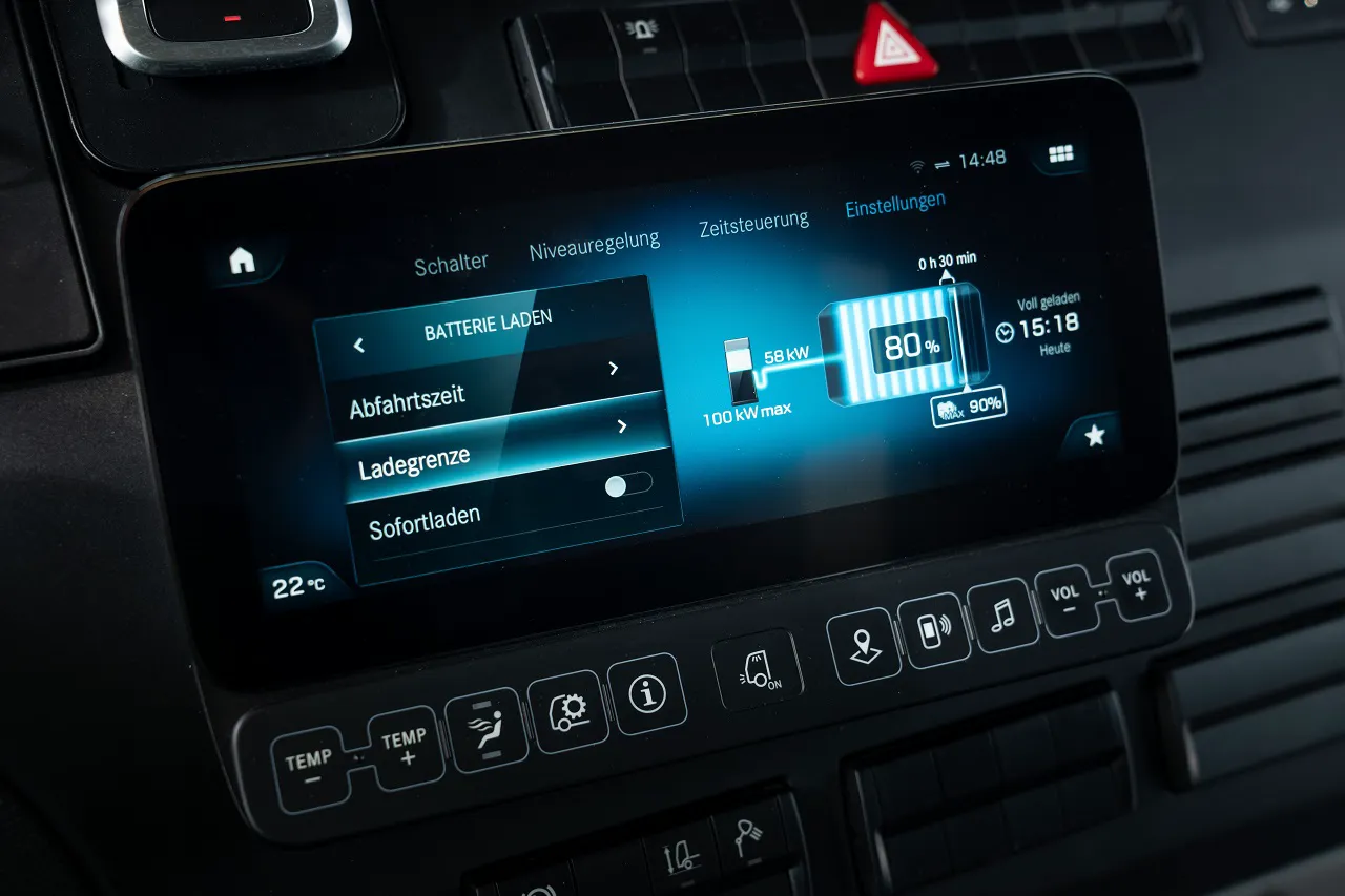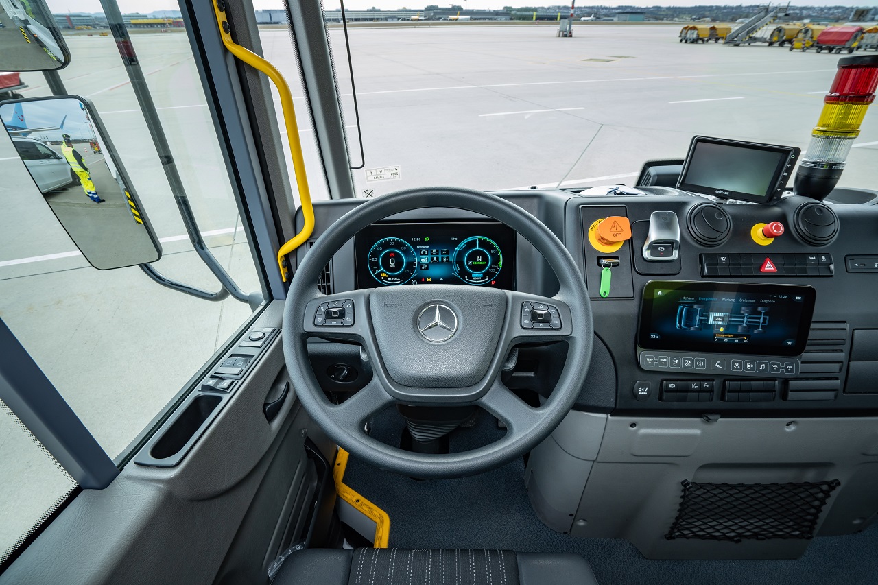 Отметим, что модель Mercedes-Benz eEconic оснащена низко расположенной кабиной Direct Vision. Через большой лобовое стекло, имеющее функцию подогрева Thermocontrol, обеспечивается отличная обзорность даже в сложных погодных условиях. А низкий уровень пола облегчает посадку-высадку операторов. Габаритная высота автопоезда не превышает 2,8 м, что позволяет ему работать непосредственно под крылом самолета, в которое, как известно, и интегрирован топливный бак.