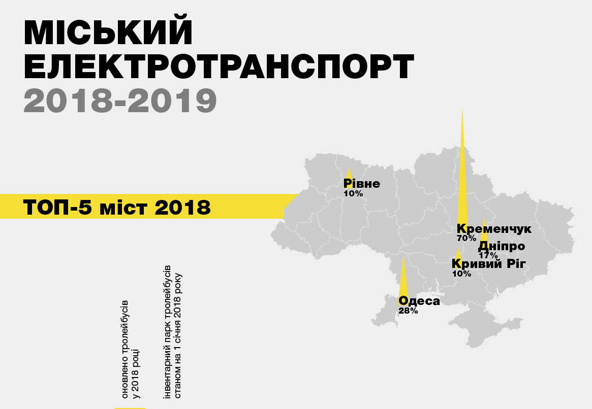 Четвертую и пятую позицию занимают Ровно и Кривой Рог, закупившие 10 и 8 троллейбусов соответственно. Доля обновления у них одинаковая – 10% от всего парка: в Ровно – 94 ед., в Кривом Роге – 78 ед.