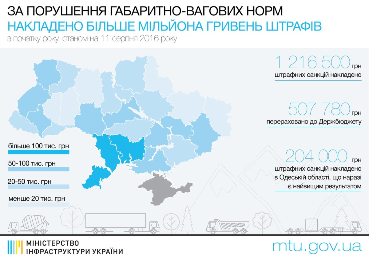 Абсолютным лидером стала Одесская область, где на сегодняшний день уже наложено 204 000 грн штрафов за превышение габаритно-весовых норм.