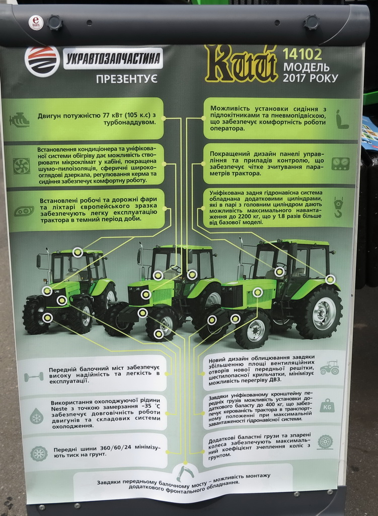 На выставке «Агро-2017», которая проходит в НК «Экспоцентр Украина» с 7 по 10 июня, компания «Укравтозапчасть» представила новый трактор отечественного производства. Машина «Кий-14102» является моделью 2017 года.