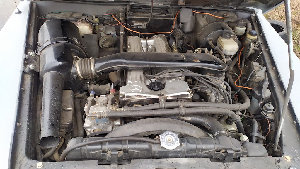 Рядная мерсовская шестерка, 2,8 литра выдает 150 сил (серия M110). Двигатель сделан по канонам немецкого моторостроения. Слева, на горячей части двигателя, где выходит выпускной коллектор, нет ничего, что может нагреваться. Все что должно быть холодным разместили вправо: систему механического впрыска топлива K-Jetronic и все навесное оборудование двигателя.