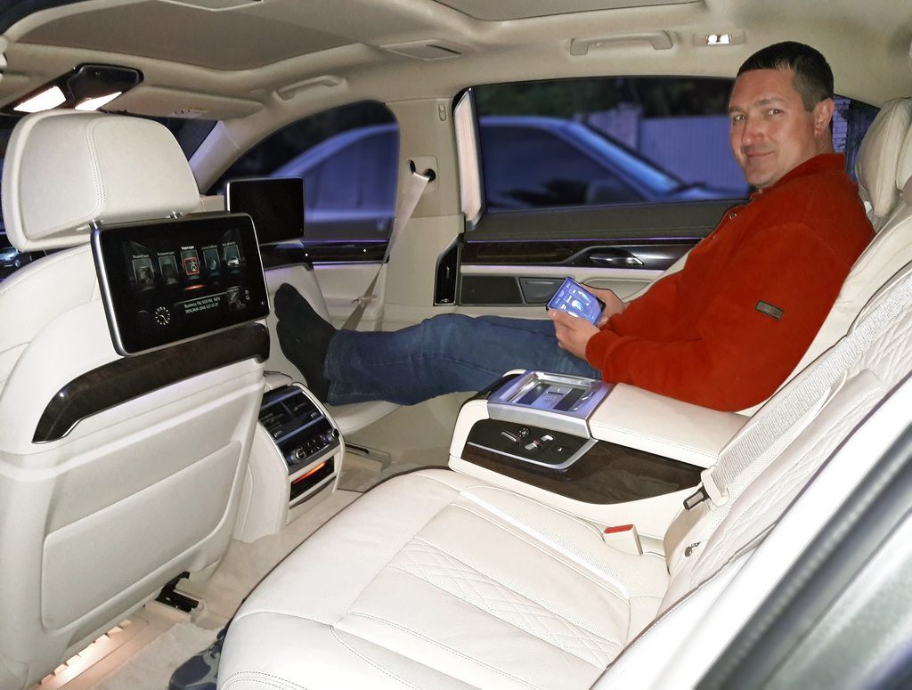 Через Wi-Fi это устройство связано с различными системами «семерки». Так что с его помощью я легко регулирую все три сиденья (два задних и переднее пассажирское), управляю массажем, вентиляцией и подогревом кресел, фоновым освещением салона, солнцезащитными шторками на панорамной крыше и на окнах в задней части салона (боковых в дверях и на заднем стекле), навигацией и развлекательными функциями.