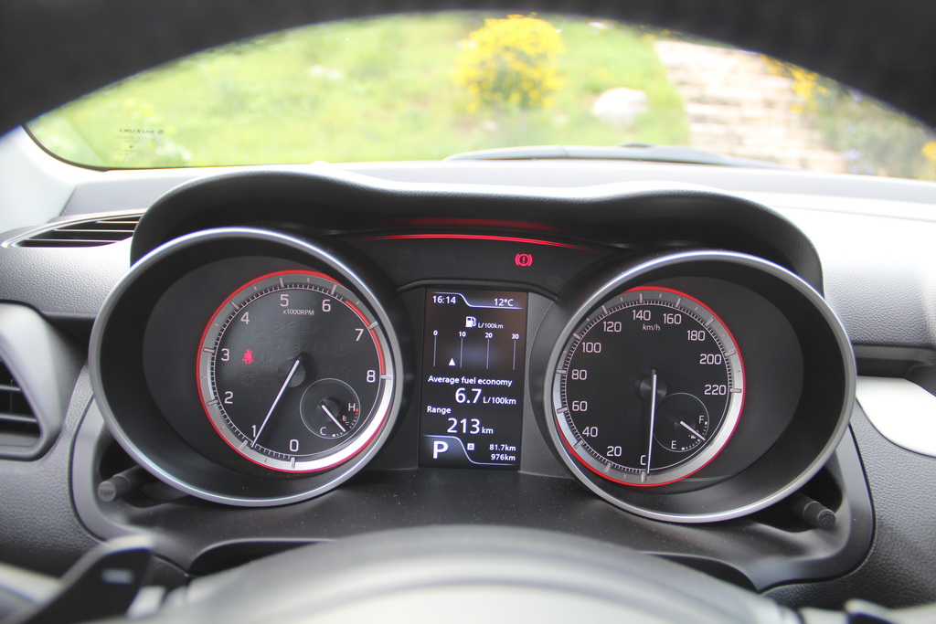Новая панель приборов – тоже на отлично. Во-первых, красиво (красное с белым, намек на спорт), во-вторых, читабельно, в третьих – информативно. На центральный 4,2-дюймовый дисплей можно вывести и традиционную информацию по расходу и пробегу, а можно – данные датчика динамической нагрузки, информацию о состоянии систем автомобиля, здесь же выводятся сигналы систем безопасности – а их в Swift на удивление много.