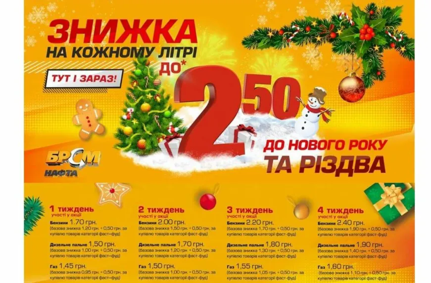 Протягом п’яти казкових тижнів, з 23 грудня 2019 по 26 січня 2020, при заправці будь-якого об’єму будь-якого палива на всіх АЗК БРСМ-Нафта, ваша знижка збільшуватиметься до 2,5 гривень на кожному літрі.
