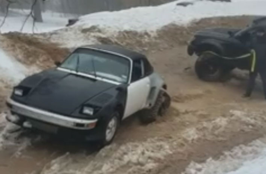 Porsche 911 на гусеницах вытаскивает из грязи пикап Toyota (видео)