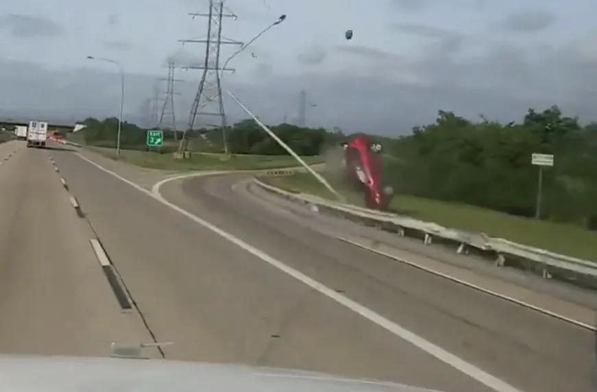 Авария случилась в США. Автомобиль двигался по прямой по скоростному шоссе. После нескольких колебаний устойчивость транспортного средства на дороге, по всей видимости, была потеряна, и красная Тойота улетела на обочину. При этом кроссовер пересек довольно широкую магистраль и в конце своего пути даже ненадолго оторвался от поверхности, а затем выполнил переворот.