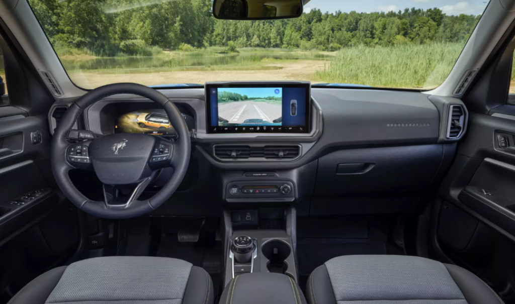 В салоне Bronco Sport Sasquatch установлена новая мультимедийная система с 13,2-дюймовым экраном, а в отделке использованы водостойкие материалы. Есть камеры кругового обзора с внедорожным режимом и дополнительные переключатели, на которые можно будет вывести управление, например, дополнительной световой балкой на крыше. Также расширили список систем помощи водителю, добавив адаптивный круиз-контроль с функцией Stop-and-Go и удержанием полосы движения.