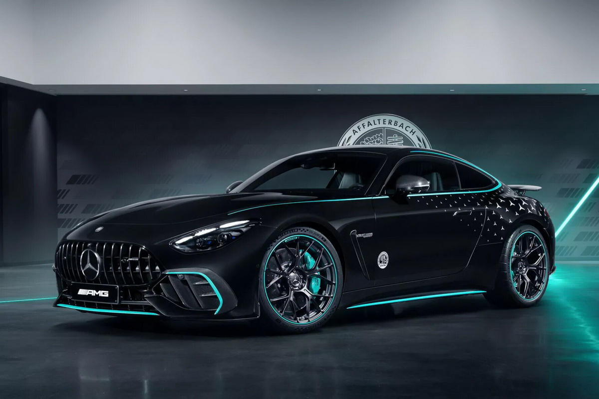 Кузов окрашен в глубокий черный цвет Obsidian Black, который дополнили пакетом AMG Nite, украсили фирменными “звездами”. Яркая “неоновая” детализация в корпоративном аквамариновом цвете Petronas подчеркивает силуэт боковых окон, пороги, 21-дюймовые колесные диски, воздухозаборники на переднем бампере, а также на огромных суппортах карбоновой тормозной системы.