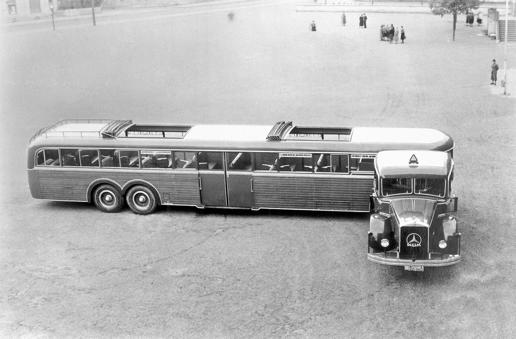 Самый большой довоенный автобус – 18,5-метровый на 170 пассажиров. Прицепной кузов – Kassbohrer. Седельный тягач – Mercedes-Benz.