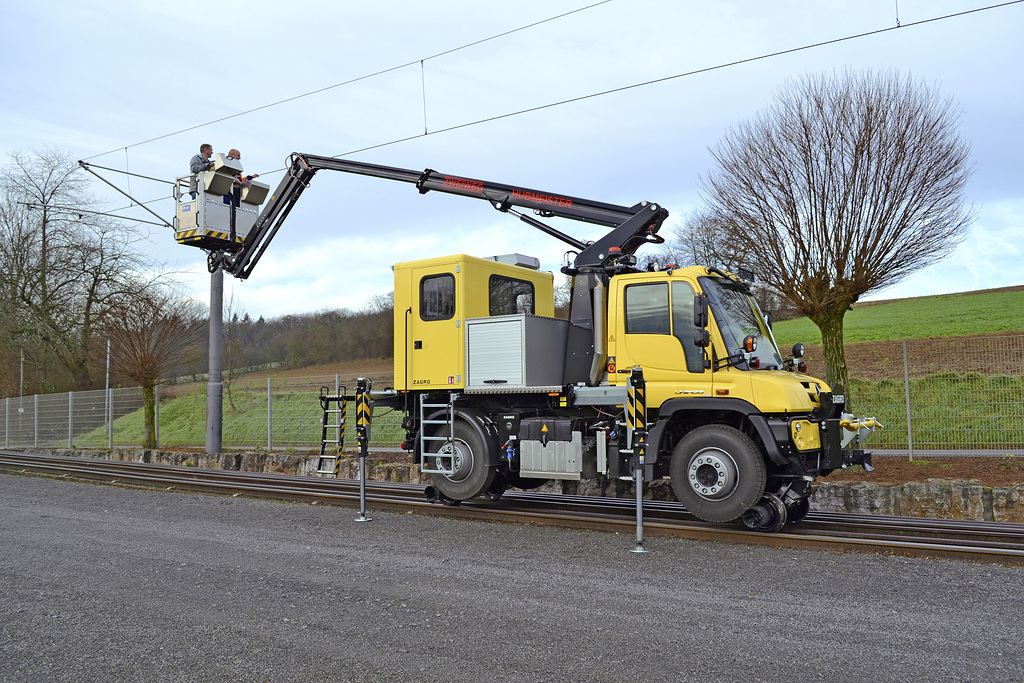 На одну их машин установили подъемный кран, а на вторую – автовышку с грузоподъемностью люльки 200 кг. А вот переоборудованием машин для движения по рельсам занималась известная немецкая компания Zagro Bahn und Baumaschinen GmbH. Благодаря специальным направляющим колесам, устанавливаемым с помощью гидравлики, автомобиль способен передвигаться как по железной дороге, в том числе и узкоколейной, так и по обычному асфальту или грунтовке.