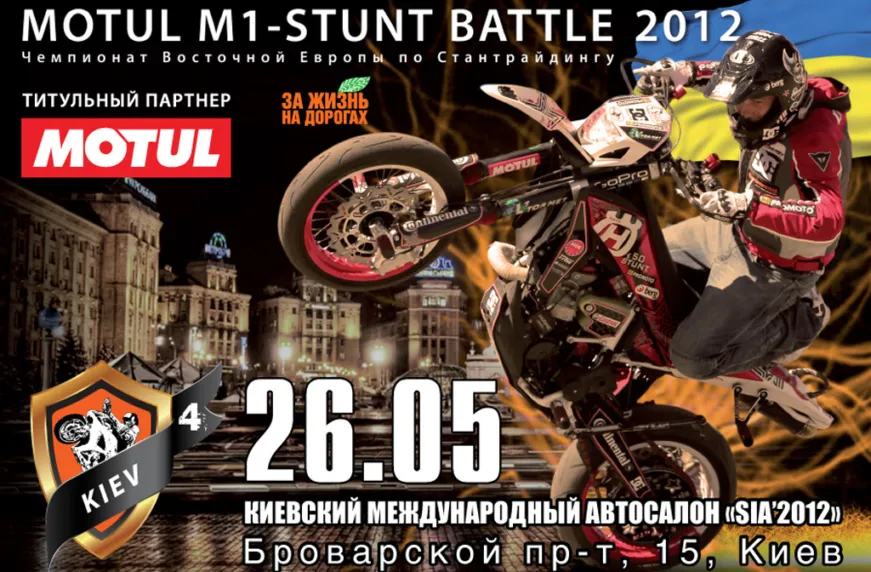 Впервые в своей истории Киевский автосалон принимает у себя этап Восточно–Европейского чемпионата, своё участие в котором подтвердили все ведущие Pro – райдеры Литвы, Латвии, Украины и России, а это значит, что асфальт вновь расплавится до дыр, а запах жжёной резины и грохот зрительских аплодисментов с головой накроет всех поклонников и ценителей трюков на мотоциклах! Состязания и показательные выступления участников чемпионата пройдут на оборудованной площадке в Международном выставочном центре на Броварском пр., 15.