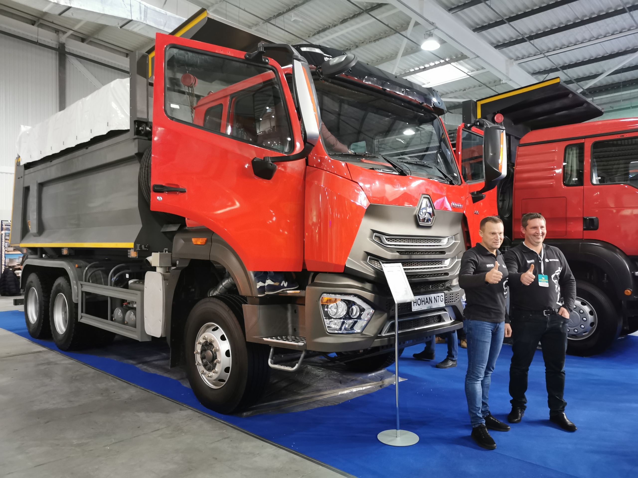 Компания «Агсолко Украина» привезла на выставку новинку – самосвал Sinotruk N7G (Hohan) колесной формулы 6х4. Машина привлекает внимание своим дизайном кабины, достаточно посмотреть на решетку радиатора и фары. В конструкции применены передовые технологии – двигатель и мосты изготовлены по лицензии MAN (немецкий производитель владеет 25% акций Sinotruk). Снаряженного масса автомобиля составляет 15 000 кг, а грузоподъемность – 26 500 кг. Нагрузка на переднюю ось – 9500 кг, а на задние – 32 000 кг.