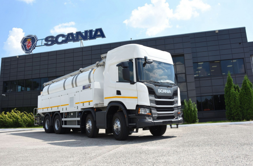 С первого взгляда и не скажешь, что этот четырехосный грузовик Scania, напоминающий автотопливозаправщик, стоит ни много ни мало один миллион евро. Все дело в специальной надстройке, установленной на шасси G440B8x4HZ Евро 5 ADR EX/3.