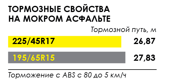 В вопросе управляемости на мокром асфальте автомобиль в шинах 225/45R17 едет значительно быстрее и откликается на повороты руля намного четче. В затяжном повороте на 17-х шинах машина также держится за дорогу несколько лучше, что позволяет ехать быстрее. Хотя начало сноса в повороте более резкое именно на 225/45R17. На шинах 195/65R15 ехать быстро на мокрой трассе не удается из-за худших реакций на повороты руля и больших уводов в сторону.