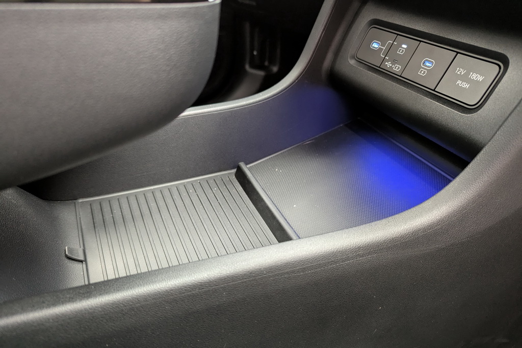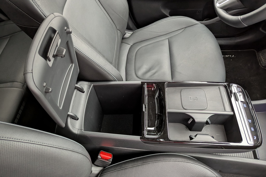 Высокая передняя консоль, которая разделяет водителя и переднего пассажира имеет подстаканники, отделение для мелочей и беспроводную зарядку для смартфона