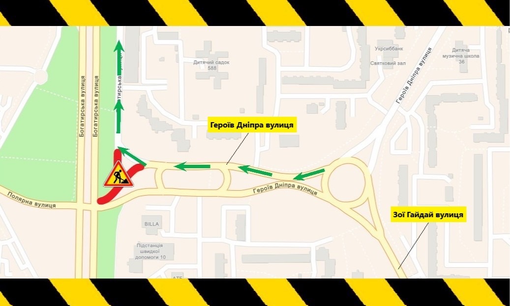 Движение в сторону Вышгорода организовано проездом вдоль ул. Богатырской. Проезд ул. Богатырской в город и с города не ограничен.