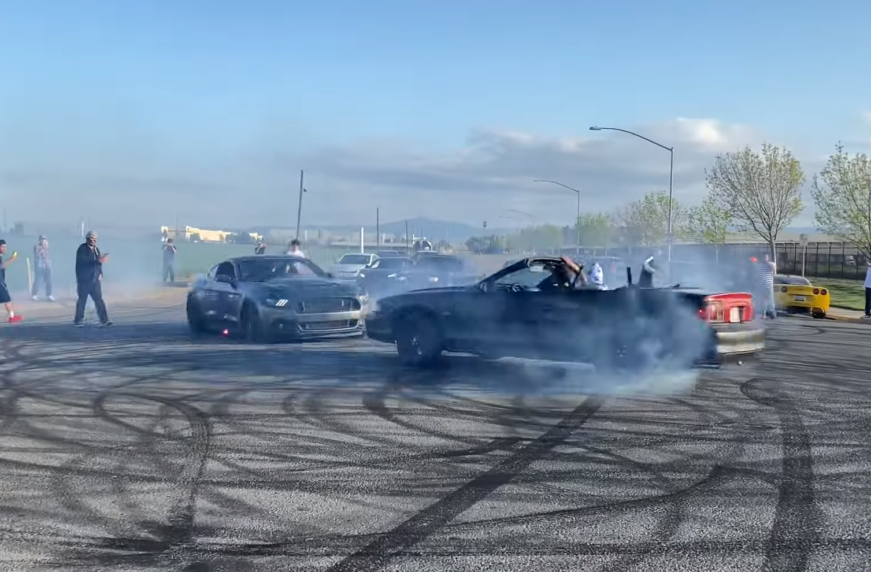 Веселье довольно быстро закончилось – ведь “крутить пончики” на узком участке асфальта решили сразу два Mustang. На видео удалось зафиксировать момент, когда к Ford Mustang 2015 решил присоединиться водитель Mustang SN95. Далее обошлось без сюрпризов – автомобили врезались друг в друга. Это произошло на 8:30 минуте ролика.