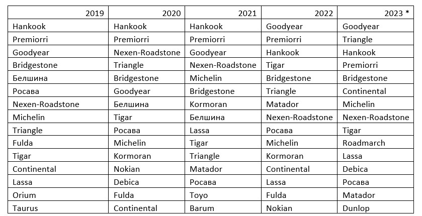 Sava, Barum, Debica, Fulda – сильно сдали позиции. Отчасти это связано с большими потерями ведущих импортеров, которые сильно пострадали в начале 2022 года.