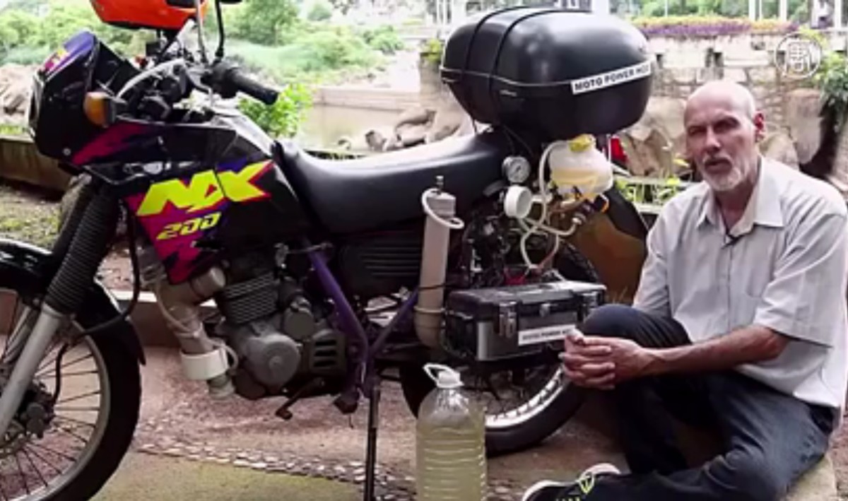 Бразильский изобретатель Рикарду Асеведу заводит свой старенький мотоцикл Honda прямо в гараже, не боясь отравится удушливыми выхлопными газами. Здесь их просто нет – вместо них выходит обычный кислород. Все дело в том, что он приспособил свой мотоцикл ездить на водороде, который в процессе электролиза выделяется из обычной воды. Таким образом, познания в физике и химии позволили Рикарду создать полностью экологический вид транспорта.