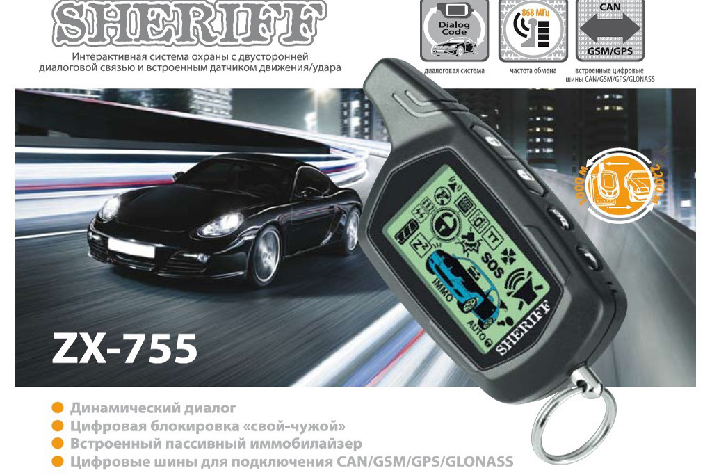 В то же время в головном блоке нет ни одного реле, что за счет бесшумности работы также содействует его лучшей маскировке. Среди общих характеристик новая охранная система автомобиля Sheriff ZX-755 предлагает целый список новаций: это автомобильная охранная система с диалоговой двухсторонней связью динамического типа, тремя сервисными каналами, системой защиты от угона и захвата автомобиля, цифровыми шинами управления блоками CAN и GSM/GPS/GLONASS. Последнее обстоятельство облегчит позиционирование автомобиля на местности при его поиске владельцем. Стоит также особо отметить, что «сигналка» обменивается информацией брелоком на новой частоте.