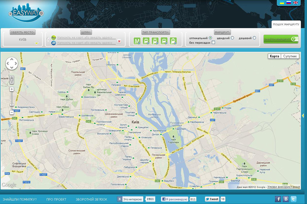 Сервисная система «Легкий путь» открывается по ссылке eway.in.ua. Сначала необходимо выбрать город. Затем приступить к маршруту – есть опция с соответствующим названием. В поле «от» вбиваете адрес отправления, в поле «до» – место прибытия. Начало и конец маршрута можно также просто показать на карте, щелкнув мышкой по нужным улицам. После этого указываете вид маршрута – оптимальный, быстрый, дешевый или без пересадок. Система предложит варианты поездок на трех различных видах транспорта.