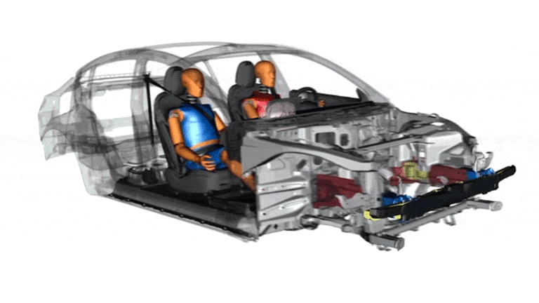 Подобный эффект минимального сминания передней части Tesla Model 3 был достигнут за счет применения: высокопрочного алюминиевого бампера, особых поперечных элементов стального подрамника, дополнительных диагональных балок в подрамнике, а также за счет крепления к верхней части передней подвески балки из мартенситной стали. Благодаря данным элементам, происходит значительное поглощение энергии фронтального удара, со смещением задней части подрамника не в салон авто, а вниз.