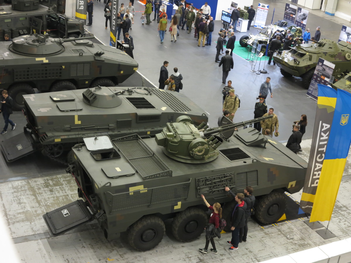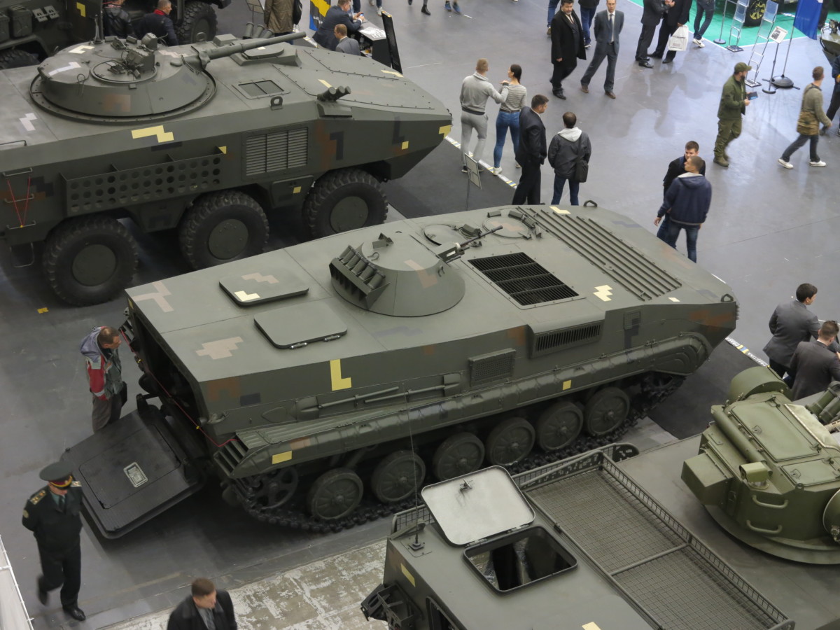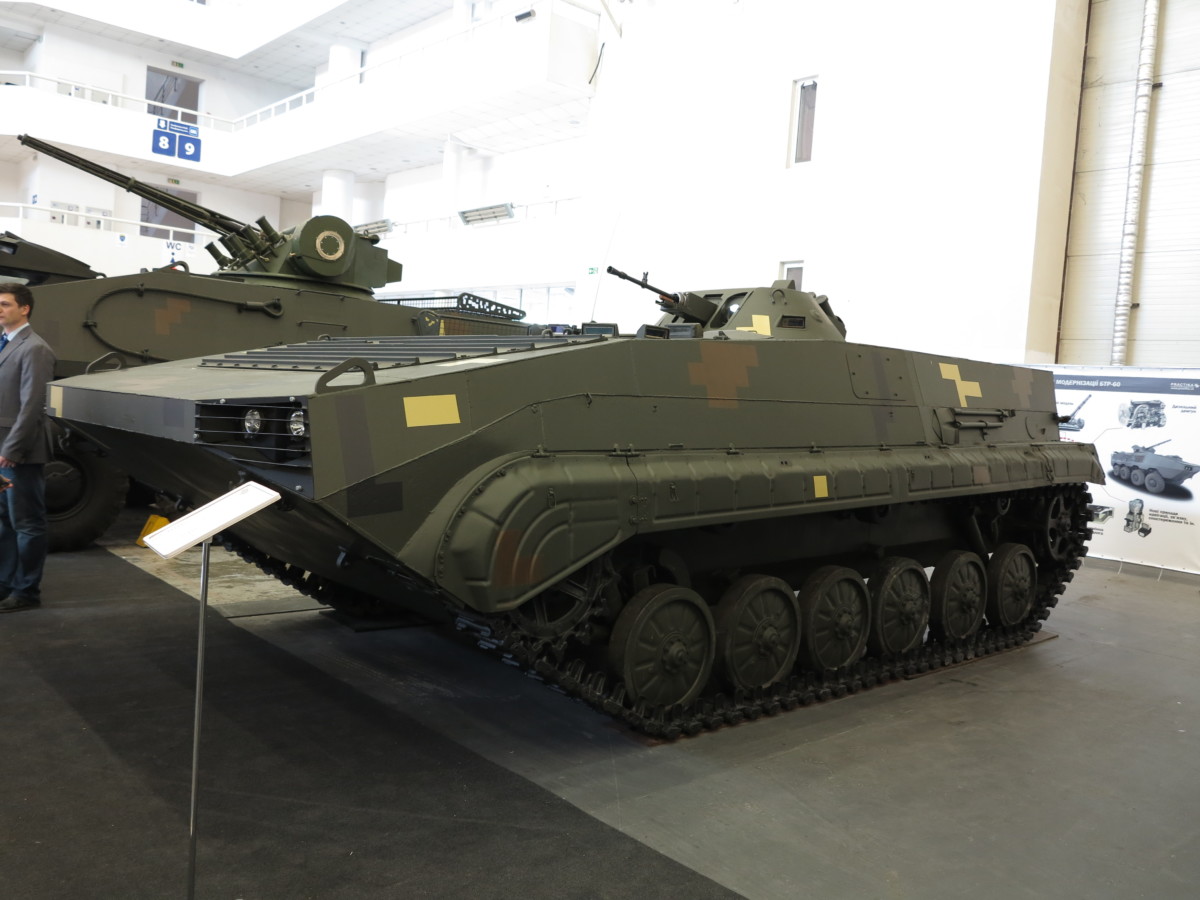 Премьера выставки – БТР-4МВ1 (8х8), который был создан специалистами «Харьковского конструкторского бюро им. Морозова» с учетом стандартов НАТО по усиленному бронированию. Здесь использован модульный подход построения бронезащиты, с применением разнесенной брони. Это позволяет в полевых условиях оперативно заменять элементы верхнего слоя брони. Немаловажно, что при этом вес БТР-4МВ1 составляет 24-25 т., что всего на 2-3 тонны больше обычной версии БТР- 4.