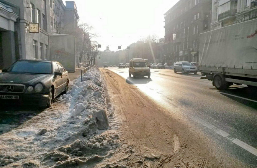 К фото прилагается комментарий автора: «Значит, ГАИ гнали-гнали паркующихся на полосе для общественного транспорта на ул. Саксаганского, да не выгнали. Полиция гнала-гнала, да не выгнала. Активисты гнали-гнали, да не выгнали. И тут пришли коммунальщики, просто насыпали снега на полосу – и вуаля! Всегда пустая полоса от автомобилей, и от общественного транспорта!»