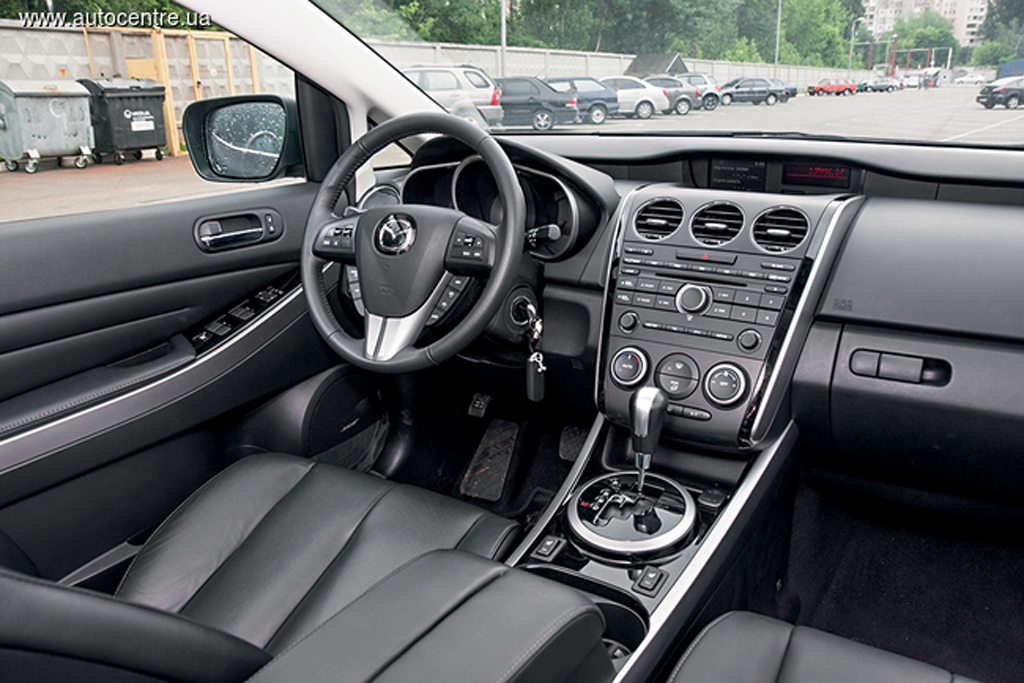 Оформление салона подчеркивает горячий темперамент CX-7: трехспицевый руль, высокий центральный тоннель, круглые колодцы щитка приборов и висящие вертикально вниз, как у спорткаров, стрелки указателей. Покритиковать можно плоские передние кресла и ограничивающие обзор передние стойки.